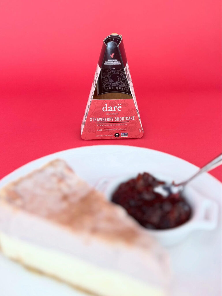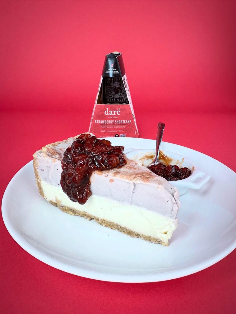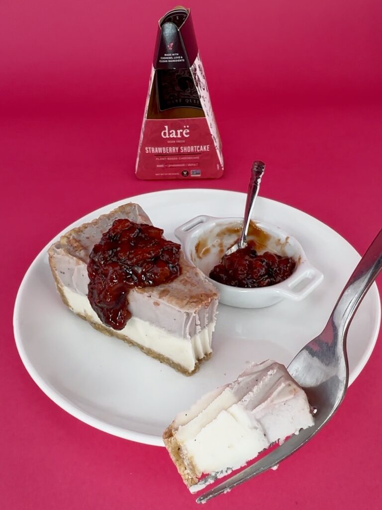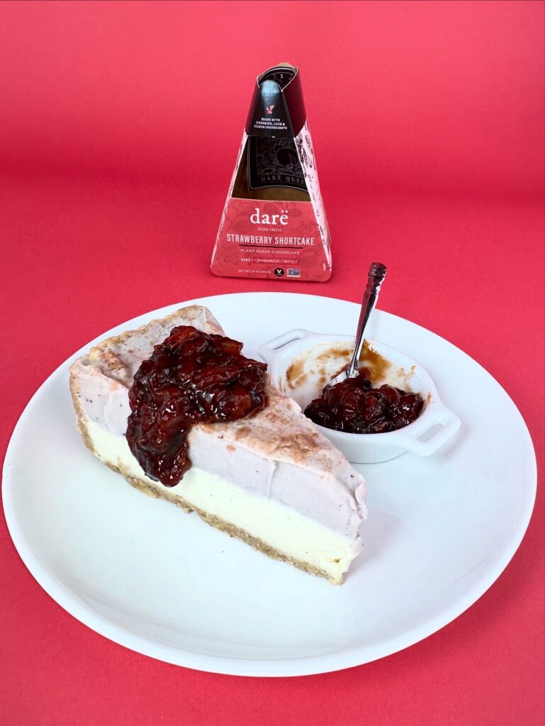 When sampling at 2025 Natural Products Expo, I came across Darë’s booth and immediately gravitated to try their Darë Vegan Strawberry Shortcake Cheesecake. I was instantly transported to a time when I was without dietary restrictions and dessert offerings came easily. A delicate combination of strawberry shortcake and cheesecake, with the crust offering as the shortcake crumble, and a layered filling of New York-style cheesecake and strawberry cheesecake. This slice isn’t overly sweet, but tangy and smooth. When enjoying at home I wanted to add a bit more sweetness, so I topped mine with a homemade strawberry compote (strawberries, sugar, and lemon juice).